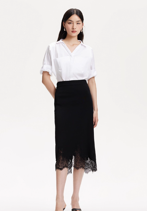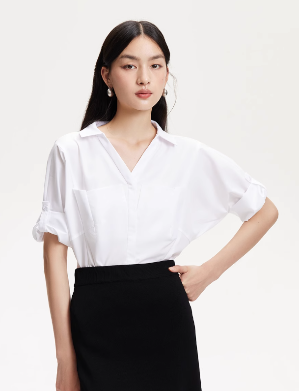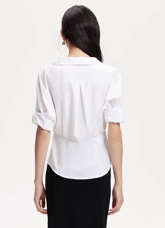 Autumn new commuter waist cinched V-neck three quarter sleeved white shirt