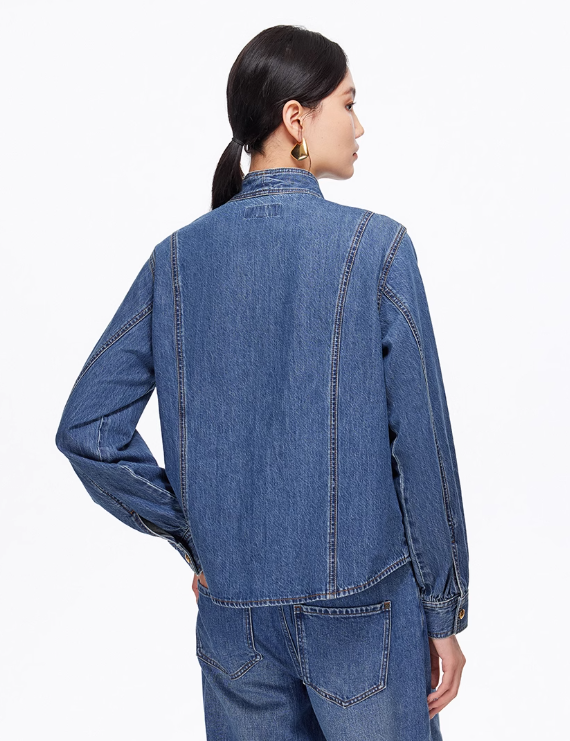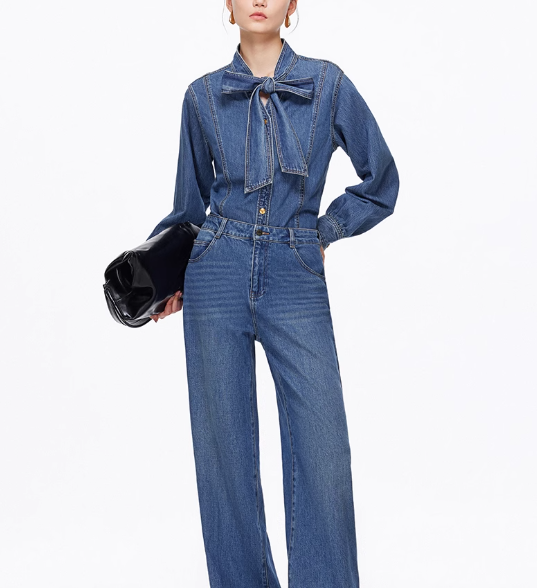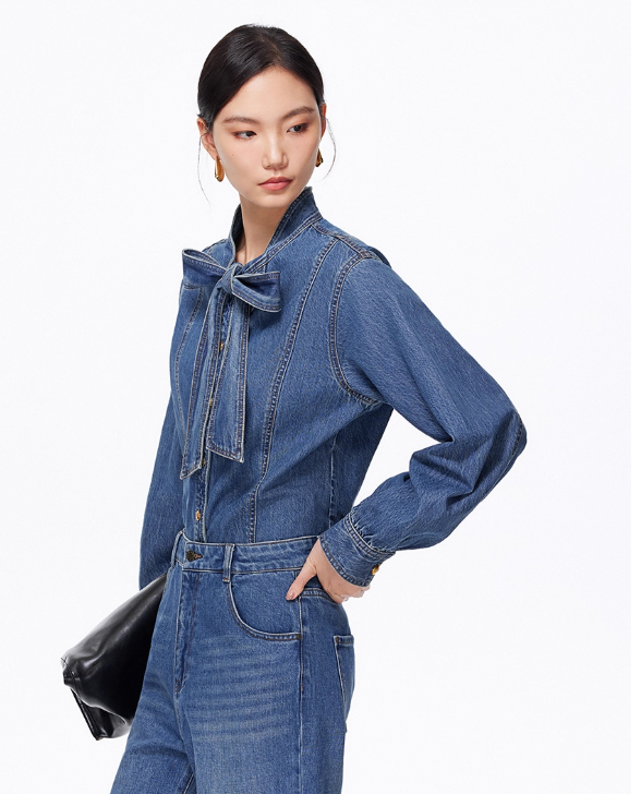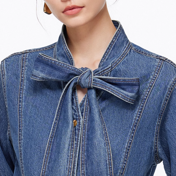 Autumn and winter new pure cotton bow tie design retro versatile denim shirt